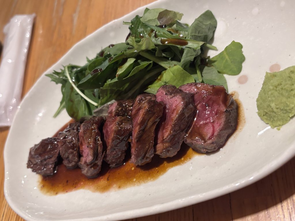 おでんや、れんこんとせりの炊合せも美味しかったけど、写真を撮り忘れたので、最後に食べたステーキを。