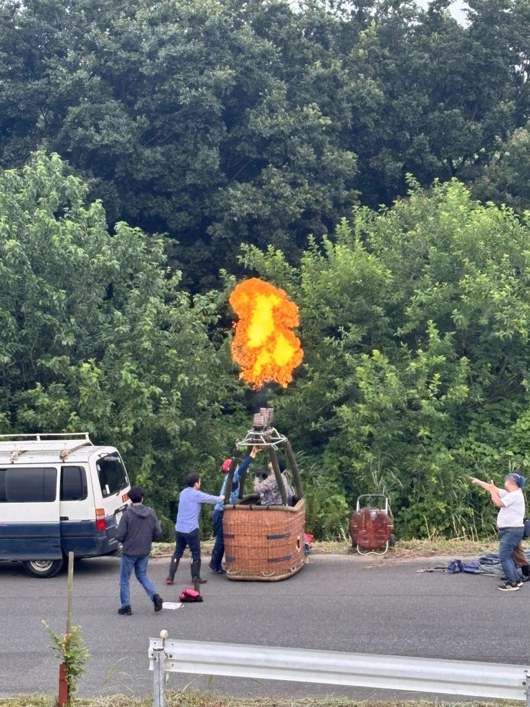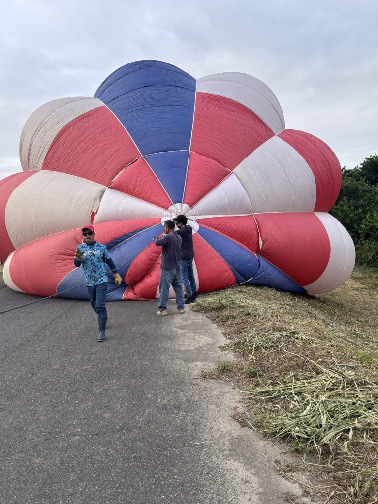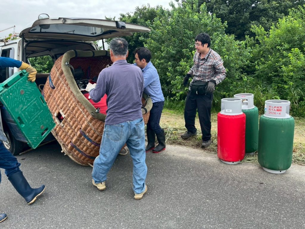 車から気球を降ろし、バーナーで温かい空気を送り込む工程にも参加させていただきました。
